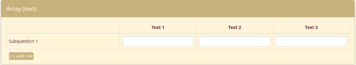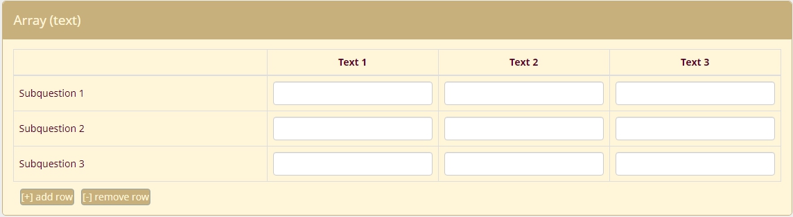 <script> $(document).ready(function() { // A function to add or remove rows of an Array (Multi Flexible)(Text) question function varLengthArray(qID) { if ($('#question'+qID+'').length > 0) { // The HTML content of the Add/Remove elements - modify as you wish var addContent = '[+] add row'; var removeContent = '[-] remove row'; // Create the Add and Remove elements & insert them var el1 = document.createElement('div'); el1.setAttribute('id','addButton'+qID); el1.setAttribute('class','btn btn-primary'); document.body.appendChild(el1); var el2 = document.createElement('div'); el2.setAttribute('id','removeButton'+qID); el2.setAttribute('class','btn btn-primary'); document.body.appendChild(el2); // Move them to after the array $( 'div#addButton'+qID ).appendTo($( '#question' + qID + ' table.ls-answers' ).parent()); $( 'div#removeButton'+qID ).appendTo($( '#question' + qID + ' table.ls-answers' ).parent()); // Insert their HTML $( 'div#addButton'+qID ).html( addContent ); $( 'div#removeButton'+qID ).html( removeContent ); // Style the elements - you can modify here if you wish $( 'div#addButton'+qID ).css({ 'margin':'10px 0 0 10px', 'padding':'1px', 'text-align':'center', 'width':'auto', 'cursor':'pointer', 'float':'left' }); $( 'div#removeButton'+qID ).css({ 'margin':'10px 0 0 10px', 'padding':'1px', 'text-align':'center', 'width':'auto', 'cursor':'pointer', 'float':'left' }); // Initially hide the Remove element $( 'div#removeButton'+qID ).hide(); // Call the functions below when clicked $( 'div#addButton'+qID ).click(function (event) { addRow(qID); }); $( 'div#removeButton'+qID ).click(function (event) { removeRow(qID); }); // Function to add a row, also shows the Remove element and hides the //Add element if all rows are shown function addRow(qID) { var arrayRow = '#question' + qID + ' table.ls-answers tr.subquestion-list'; var rowCount = $( arrayRow ).size() - 1; $( arrayRow + '[name="hidden"]:first' ).attr('name', 'visible').show(); $( 'div#removeButton'+qID ).show(); if ( $( arrayRow + ':eq(' + rowCount + ')' ).attr('name') == 'visible' ) { $( 'div#addButton'+qID ).hide(); } } // Function to remove a row, also clears the contents of the removed row, // shows the Add element if the last row is hidden and hides the Remove // element if only the first row is shown function removeRow(qID) { var arrayRow = '#question' + qID + ' table.ls-answers tr.subquestion-list'; var rowCount = $( arrayRow ).size() - 1; $( arrayRow + '[name="visible"]:last input[type="text"]' ).val(''); $( arrayRow + '[name="visible"]:last' ).attr('name', 'hidden').hide(); $( 'div#addButton'+qID ).show(); if ( $( arrayRow + ':eq(1)' ).attr('name') == 'hidden' ) { $( 'div#removeButton'+qID ).hide(); } } // Just some initialization stuff var arrayRow = '#question' + qID + ' table.ls-answers tr.subquestion-list'; var rowCount = ''; // Initially hide all except first row or any rows with populated inputs $( arrayRow ).each(function(i) { if ( i > 0 ) { // We also need to give the hidden rows a name cause IE doesn't // recognize jQuery :visible selector consistently $( this ).attr('name', 'hidden').hide(); $('input[type=text]', this).each(function(i) { if ($(this).attr('value') != '') { $(this).parents('tbody:eq(0)').attr('name', 'visible').show(); $( 'div#removeButton'+qID ).show(); } }); rowCount = i; } }); } } // Call the function with a question ID varLengthArray({QID}); }); </script>