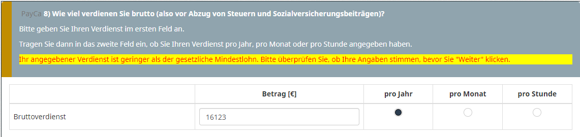 Though it is not related to the topic, here some - in my opinion - better solutions to ask for "Bruttolohn" and "Einheit".
