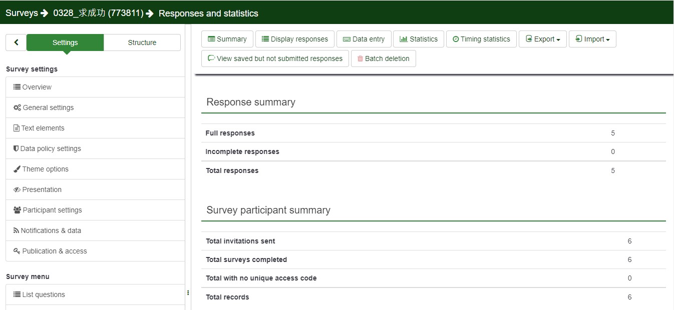 As the screenshot shows, we sent out 6 survey invitations to our team, and we completed and submitted these interviews (“Total survey completed = 6”), but we got only 5 responses (“Full responses = 5” and “Incomplete responses = 0”); one respondent’s response is missing – it never shows up in the “Responses” page of the LimeSurvey system.