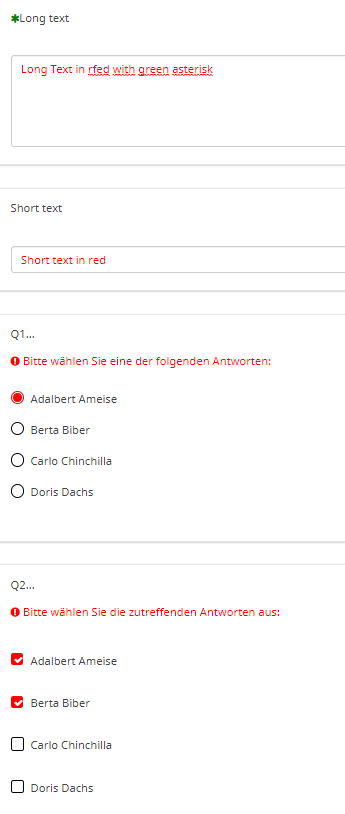 /* color of text in text boxes */ .fruity textarea.form-control, .fruity input[type="text"] { color:red; } /* color of asterisk .asterisk .text-danger { color: green; } /* color of help text */ .fruity .text-info { color: red; } /* colors of active radio-buttons, checkboxes */ .radio-item label::before { border-color: black; } .radio-item input[type="radio"]:checked + label::before { border-color: red; } .radio-item input[type="radio"]:checked + label::after { background: red; } .checkbox-item label::before { border-color: black; } .checkbox-item input[type="checkbox"]:checked + label::before { border-color: red; } .checkbox-item input[type="checkbox"]:checked + label::after { background: red; }