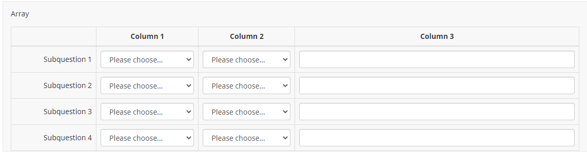 <style type="text/css">.custom-array table.subquestion-list col { width: auto !important; } .custom-array table.subquestion-list thead .column-0 { width: 15%; } .custom-array table.subquestion-list thead .column-1 { width: 20%; } .custom-array table.subquestion-list thead .column-2 { width: 10%; } .custom-array table.subquestion-list thead .column-3 { width: 30%; } .custom-array table.subquestion-list thead .column-4 { width: 25%; } </style>