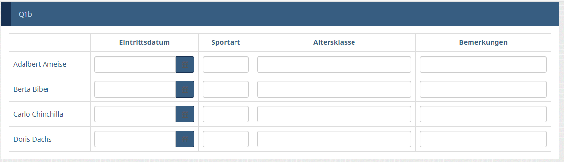 <p><script type="text/javascript" charset="utf-8"> $(document).on('ready pjax:scriptcomplete',function(){ var rootPath = location.pathname.split('index.php')[0]; // Identify this question var thisQuestion = $('#question{QID}'); $('head').append('<link rel="stylesheet" href="'+rootPath+'assets/packages/bootstrap/plugins/datetimepicker/build/css/bootstrap-datetimepicker.min.css" type="text/css" />'); $.getScript(rootPath+'assets/packages/bootstrap/plugins/datetimepicker/build/js/bootstrap-datetimepicker.min.js') .done(function(script, textStatus) { // Insert the date-time-pickers $('.answer-item:nth-child(2) input:text', thisQuestion).each(function(i) { var thisID = $(this).attr('id'); $(this).addClass('date-control date datetimepicker') .wrap('<div id="datetimepicker_'+thisID+'" class="input-group date date-timepicker-group" />') .after('<div class="input-group-addon datetimepicker-addon btn btn-primary">\ <i class="fa fa-calendar" aria-hidden="true"></i><span class="sr-only"></span>\ </div>'); $('#datetimepicker_'+thisID+'').datetimepicker({ useCurrent:false, allowInputToggle: true, format: 'DD.MM.YYYY' }); }); }) .fail(function( jqxhr, settings, exception ) { console.log(exception); }); // Add a question class thisQuestion.addClass('custom-array'); // Column-specific classes $('table.subquestion-list tr', thisQuestion).each(function(i) { $('th, td', this).each(function(i) { $(this).addClass('column-'+i); }); }); </script></p> <style type="text/css">.custom-array table.subquestion-list col { width: auto !important; } .custom-array table.subquestion-list thead .column-0 { width: 10%; } .custom-array table.subquestion-list thead .column-1 { width: 20%; } .custom-array table.subquestion-list thead .column-2 { width: 60%; } .custom-array table.subquestion-list thead .column-3 { width: 10%; } </style>