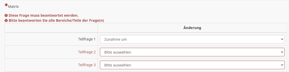 <script type="text/javascript" data-author="Tony Partner"> $(document).on('ready pjax:scriptcomplete',function(){ var thisQuestion = $('#question{QID}'); if($('.inserted-select', thisQuestion).length == 0) { // Column-specific classes $('tr.subquestion-list', thisQuestion).each(function(i) { $('th, td', this).each(function(i) { $(this).addClass('column-'+i); }); }); // Insert selects into column 1 if($('.answer-item.column-1 .inserted-select', thisQuestion).length == 0) { $('.answer-item.column-1', thisQuestion).addClass('with-select').append('<select class="inserted-select form-control list-question-select">\ <option value="" selected>Bitte auswählen...</option>\ <option value="1">Zunahme um</option>\ <option value="0">Gleichbleibend</option>\ <option value="2">Abnahme um</option>\ </select>'); } // Insert selects into column 3 if($('.answer-item.column-3 .inserted-select', thisQuestion).length == 0) { $('.answer-item.column-3', thisQuestion).addClass('with-select').append('<select class="inserted-select form-control list-question-select">\ <option value="" selected>Bitte auswählen...</option>\ <option value="1">Zunahme um</option>\ <option value="0">Gleichbleibend</option>\ <option value="2">Abnahme um</option>\ </select>'); } // Insert selects into column 5 if($('.answer-item.column-5 .inserted-select', thisQuestion).length == 0) { $('.answer-item.column-5', thisQuestion).addClass('with-select').append('<select class="inserted-select form-control list-question-select">\ <option value="" selected>Bitte auswählen...</option>\ <option value="1">Zunahme um</option>\ <option value="0">Gleichbleibend</option>\ <option value="2">Abnahme um</option>\ </select>'); } // Listeners $('.inserted-select', thisQuestion).on('change', function(i) { if($(this).val() != '') { $(this).closest('.answer-item').find('input:text').val($('option:selected', this).val()).trigger('change'); } else { $(this).closest('.answer-item').find('input:text').val('').trigger('change'); } }); // Returning to page $('.with-select input:text', thisQuestion).each(function(i) { var thisCell = $(this).closest('.answer-item'); var inputText = $.trim($(this).val()); $('select.inserted-select', thisCell).val(inputText); }); // Listener on column 2 inputs $('.answer-item.answer_cell_change input:text', thisQuestion).on('keyup change', function(e) { var thisValue = $.trim($(this).val()); // Numerics only if($.isNumeric(thisValue) === false) { // Strip out non-numerics characters newValue = thisValue.replace(/\D/g,''); $(this).val(newValue).trigger('change'); } // Max/min values var maxAllowed = 100; var minAllowed = 0; if (thisValue > maxAllowed) { alert('The maximum allowed is '+maxAllowed+'.'); $(this).val(maxAllowed); } else if (thisValue < minAllowed) { alert('The minimum allowed is '+minAllowed+'.'); $(this).val(minAllowed); } }); // Clean-up styles $('select.inserted-select', thisQuestion).css({ 'max-width': '100%' }); $('.with-select input:text', thisQuestion).css({ 'position': 'absolute', 'left': '-9999em' }); } }); </script>