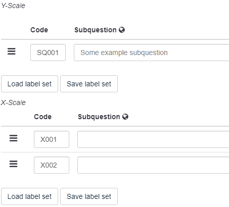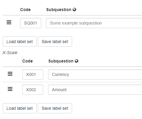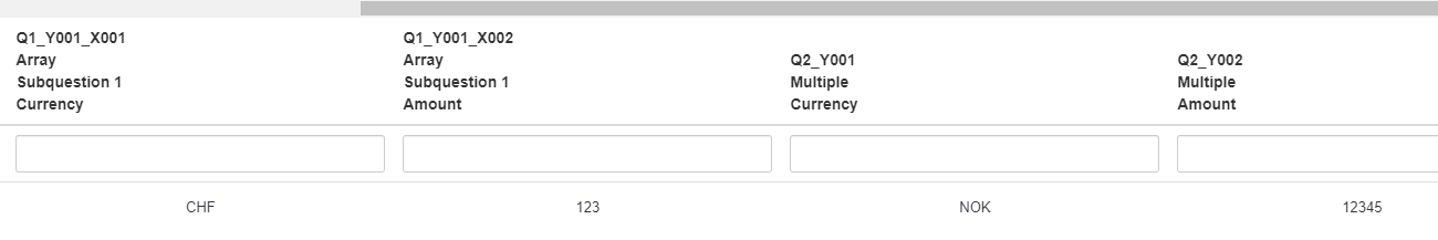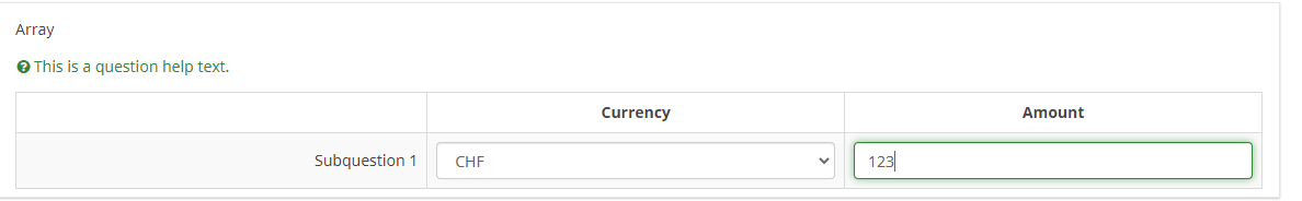<script type="text/javascript" charset="utf-8"> $(document).on('ready pjax:scriptcomplete',function(){ var thisQuestion = $('#question{QID}'); // Column-specific classes $('tr.subquestion-list', thisQuestion).each(function(i) { $('th, td', this).each(function(i) { $(this).addClass('column-'+i); }); }); // Insert selects into column 1 if($('.answer-item.column-1 .inserted-select', thisQuestion).length == 0) { $('.answer-item.column-1', thisQuestion).addClass('with-select').append('<select class="inserted-select form-control list-question-select">\ <option value="">Please choose...</option>\ <option value="USD">USD</option> \ <option value="EUR">EUR</option> \ <option value="GBP">GBP</option> \ <option value="CHF">CHF</option> \ <option value="AUD">AUD</option> \ <option value="JPY">JPY</option> \ <option value="CAD">CAD</option> \ <option value="NOK">NOK</option> \ <option value="SEK">SEK</option> \ </select>'); } // Listeners on select elements $('.inserted-select', thisQuestion).on('change', function(i) { if($(this).val() != '') { $(this).closest('.answer-item').find('input:text').val($.trim($('option:selected', this).text())).trigger('change'); } else { $(this).closest('.answer-item').find('input:text').val('').trigger('change'); } }); // Listener on column 2 inputs $('.answer-item.column-2 input:text', thisQuestion).on('keyup change', function(e) { var thisValue = $.trim($(this).val()); // Numerics only if($.isNumeric(thisValue) === false) { // Strip out non-numerics characters newValue = thisValue.replace(/\D/g,''); $(this).val(newValue).trigger('change'); } }); // Returning to page $('.with-select input:text', thisQuestion).each(function(i) { var thisCell = $(this).closest('.answer-item'); var inputText = $.trim($(this).val()); var selectval = $('select.inserted-select option', thisCell).filter(function () { return $(this).html() == inputText; }).val(); $('select.inserted-select', thisCell).val(selectval); }); // Clean-up styles $('select.inserted-select', thisQuestion).css({ 'max-width': '100%' }); $('.with-select input:text', thisQuestion).css({ 'position': 'absolute', 'left': '-9999em' }); }); </script>