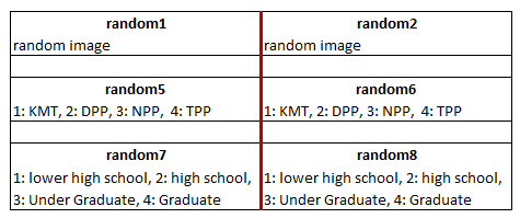 <td bgcolor="#f2f2f2" style="text-align: center;"><span style="font-size:20px;"><strong><span style="color:#000000;"><span style="font-family:標楷體;">{if(random5== 1, 'KMT',if(random5== 2, 'DPP',if(random5== 3, 'NPP',if(random5== 4, 'TPP','NA'))))}</span></span></strong></span></td> <td bgcolor="#f2f2f2" style="text-align: center;"><p><span style="font-size:20px;"><strong><span style="color:#000000;"><span style="font-family:標楷體;">{if(random7== 1, 'lower high school',if(random7== 2, 'high school',if(random7== 3, 'Under Graduate','Graduate')))}</span></span></strong></span></p>