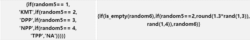 {if(random5== 1, 'KMT',if(random5== 2, 'DPP',if(random5== 3, 'NPP',if(random5== 4, 'TPP','NA'))))} {if(is_empty(random6),if(random5==2,rand(3, 4), rand(1,4)),random6)}