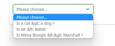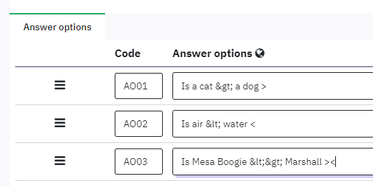 You can not use < or > in text if XSS is activated.However, if I use > in the answer option, it just shows > like normal.