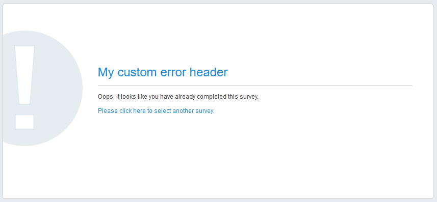 {% set customContent = false %} {% if 'You have already completed this survey' in aError.message %} {% set customContent = true %} {% endif %}