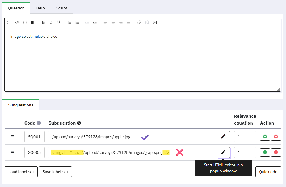 You see that this question is changed to a simple "list(radio)"Why are you entering the complete src attribute. Try simply entering the path. No "src", no quotes.