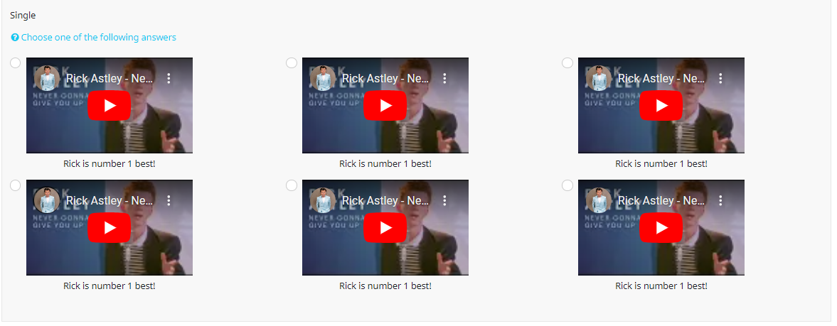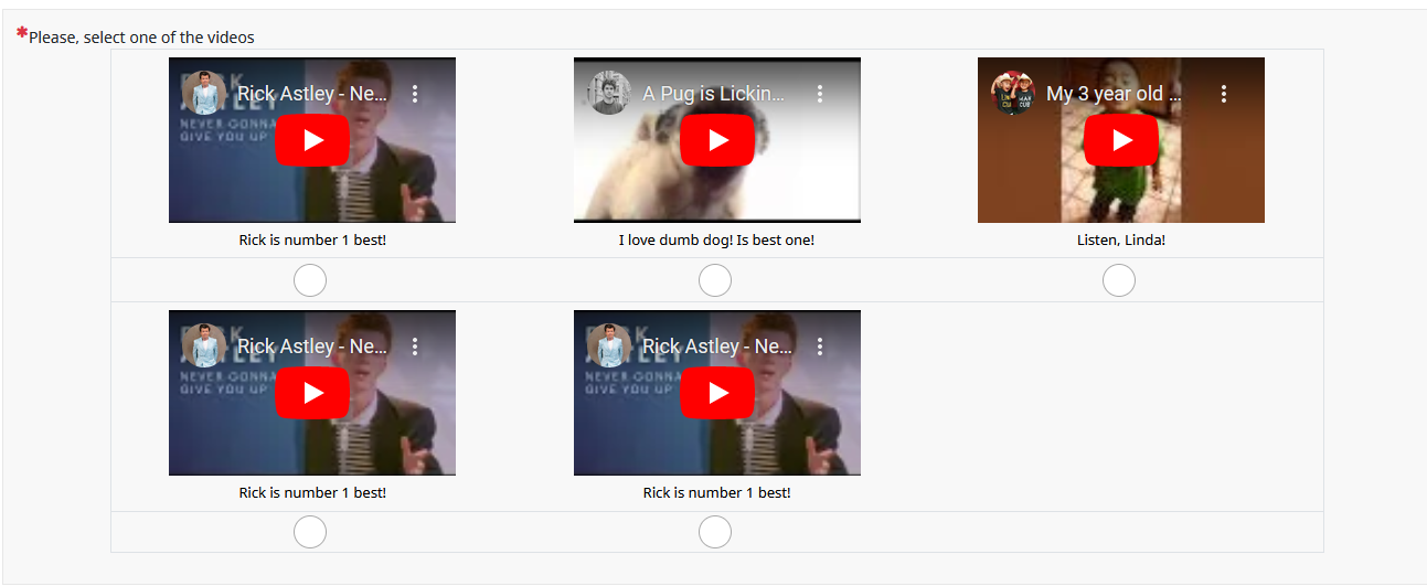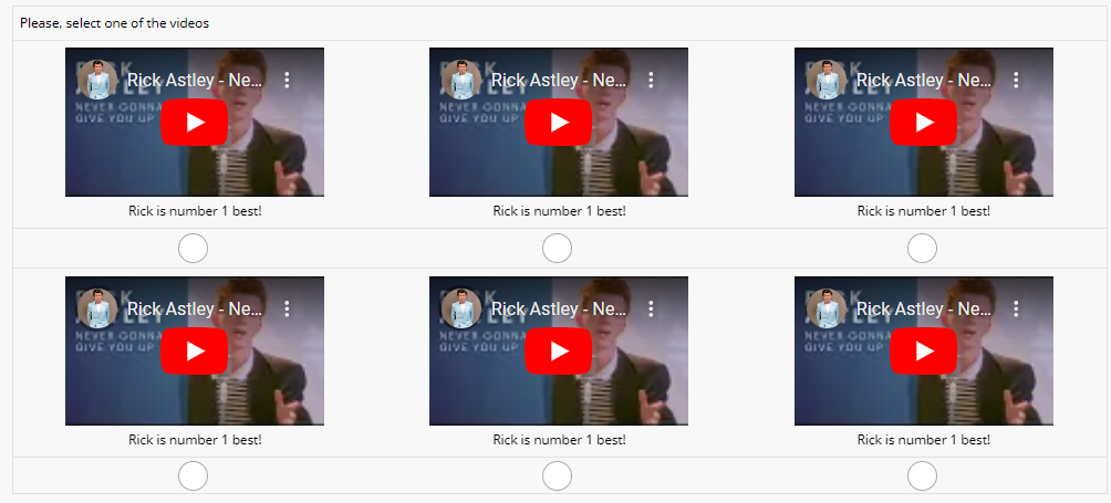 Please, select one of the videos <table align="center" border="4" cellpadding="5" cellspacing="3" class="table table-responsive" style="width:1100px"> <tbody> <tr style="height:80px;"> <td class="td0 center"><iframe allow="accelerometer; autoplay; clipboard-write; encrypted-media; gyroscope; picture-in-picture; web-share" allowfullscreen="" frameborder="0" sandbox="allow-scripts allow-same-origin" src="https://www.youtube.com/embed/dQw4w9WgXcQ?si=a6VETbKPaM6S-B3K" title="YouTube video player" width="260"></iframe> <center>Rick is number 1 best!</center> </td> <td class="td0 center"><iframe allow="accelerometer; autoplay; clipboard-write; encrypted-media; gyroscope; picture-in-picture; web-share" allowfullscreen="" frameborder="0" sandbox="allow-scripts allow-same-origin" src="https://www.youtube.com/embed/megGOXIJBEE?si=UphxFyIBF4jukAhM" title="YouTube video player" width="260"></iframe> <center>I love dumb dog! Is best one!</center> </td> <td class="td0 center"><iframe allow="accelerometer; autoplay; clipboard-write; encrypted-media; gyroscope; picture-in-picture; web-share" allowfullscreen="" frameborder="0" sandbox="allow-scripts allow-same-origin" src="https://www.youtube.com/embed/aFYsJYPye94?si=uo4ijj025WCqFSvf" title="YouTube video player" width="260"></iframe> <center>Listen, Linda!</center> </td> </tr> <tr style="height:40px;"> <td class="td0 center"> </td> <td class="td0 center"> </td> <td class="td0 center"> </td> </tr> <tr style="height:80px;"> <td class="td0 center"><iframe allow="accelerometer; autoplay; clipboard-write; encrypted-media; gyroscope; picture-in-picture; web-share" allowfullscreen="" frameborder="0" sandbox="allow-scripts allow-same-origin" src="https://www.youtube.com/embed/dQw4w9WgXcQ?si=a6VETbKPaM6S-B3K" title="YouTube video player" width="260"></iframe> <center>Rick is number 2 best!</center> </td> <td class="td0 center"><iframe allow="accelerometer; autoplay; clipboard-write; encrypted-media; gyroscope; picture-in-picture; web-share" allowfullscreen="" frameborder="0" sandbox="allow-scripts allow-same-origin" src="https://www.youtube.com/embed/dQw4w9WgXcQ?si=a6VETbKPaM6S-B3K" title="YouTube video player" width="260"></iframe> <center>Rick is number 3 best!</center> </td> <td class="td0 center"><iframe allow="accelerometer; autoplay; clipboard-write; encrypted-media; gyroscope; picture-in-picture; web-share" allowfullscreen="" frameborder="0" sandbox="allow-scripts allow-same-origin" src="https://www.youtube.com/embed/9bZkp7q19f0?si=liCgEsZAzFwxta2R" title="YouTube video player" width="260"></iframe> <center>Gangnam Style!!</center> </td> </tr> <tr style="height:40px;"> <td class="td0 center"> </td> <td class="td0 center"> </td> <td class="td0 center"> </td> </tr> <tr style="height:80px;"> <td class="td0 center"><iframe allow="accelerometer; autoplay; clipboard-write; encrypted-media; gyroscope; picture-in-picture; web-share" allowfullscreen="" frameborder="0" sandbox="allow-scripts allow-same-origin" src="https://www.youtube.com/embed/wyx6JDQCslE?si=iFz2VOnqOoF7dzQp" title="YouTube video player" width="260"></iframe> <center>LMFAO!</center> </td> <td class="td0 center"><iframe allow="accelerometer; autoplay; clipboard-write; encrypted-media; gyroscope; picture-in-picture; web-share" allowfullscreen="" frameborder="0" sandbox="allow-scripts allow-same-origin" src="https://www.youtube.com/embed/kfVsfOSbJY0?si=o-FHINPPM_RcWPQl" title="YouTube video player" width="260"></iframe> <center>It's Friday!</center> </td> <td class="td0 center"><iframe allow="accelerometer; autoplay; clipboard-write; encrypted-media; gyroscope; picture-in-picture; web-share" allowfullscreen="" frameborder="0" sandbox="allow-scripts allow-same-origin" src="https://www.youtube.com/embed/MtN1YnoL46Q?si=VQa44r3o7B3be6rY" title="YouTube video player" width="260"></iframe> <center>Quack</center> </td> </tr> <tr style="height:40px;"> <td class="td0 center"> </td> <td class="td0 center"> </td> <td class="td0 center"> </td> </tr> </tbody> </table> <script type="text/javascript" charset="utf-8"> $(document).on('ready pjax:scriptcomplete',function(){ // Identify this question var thisQuestion = $('#question{QID}'); // Move the radios $('.question-text table:eq(0) tr:eq(1) td:eq(0)', thisQuestion).prepend($('.subquestion-list .answers-list:eq(0) .answer-item:eq(0) *', thisQuestion)); $('.question-text table:eq(0) tr:eq(1) td:eq(1)', thisQuestion).prepend($('.subquestion-list .answers-list:eq(0) .answer-item:eq(1) *', thisQuestion)); $('.question-text table:eq(0) tr:eq(1) td:eq(2)', thisQuestion).prepend($('.subquestion-list .answers-list:eq(0) .answer-item:eq(2) *', thisQuestion)); $('.question-text table:eq(0) tr:eq(3) td:eq(0)', thisQuestion).prepend($('.subquestion-list .answers-list:eq(0) .answer-item:eq(3) *', thisQuestion)); $('.question-text table:eq(0) tr:eq(3) td:eq(1)', thisQuestion).prepend($('.subquestion-list .answers-list:eq(0) .answer-item:eq(4) *', thisQuestion)); $('.question-text table:eq(0) tr:eq(3) td:eq(2)', thisQuestion).prepend($('.subquestion-list .answers-list:eq(0) .answer-item:eq(5) *', thisQuestion)); $('.question-text table:eq(0) tr:eq(5) td:eq(0)', thisQuestion).prepend($('.subquestion-list .answers-list:eq(0) .answer-item:eq(6) *', thisQuestion)); $('.question-text table:eq(0) tr:eq(5) td:eq(1)', thisQuestion).prepend($('.subquestion-list .answers-list:eq(0) .answer-item:eq(7) *', thisQuestion)); $('.question-text table:eq(0) tr:eq(5) td:eq(2)', thisQuestion).prepend($('.subquestion-list .answers-list:eq(0) .answer-item:eq(8) *', thisQuestion)); // Some classes for presentation $('.question-text table:eq(0) input:radio', thisQuestion).closest('td').addClass('answer-item radio-item text-center radio'); $('.question-text table:eq(0) .radio-item label', thisQuestion).show(); // Click event on the table cells $('.question-text table:eq(0) .radio-item', thisQuestion).on('click', function(e) { $('input:radio', this).trigger('click'); }); $('.question-text table:eq(0) inp