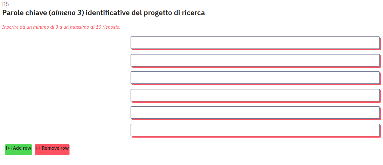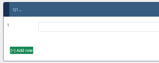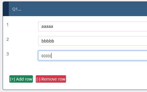 <script> $(document).ready(function() { // A function to add or remove rows of an "multiple short text" question function varLengthArray(qID) { if ($('#question'+qID+'').length > 0) { // The HTML content of the Add/Remove elements - modify as you wish var addContent = '[+] Add row'; var removeContent = '[-] Remove row'; // Create the Add and Remove elements & insert them // Adjust colors by using other bootstrap classes // „btn-primary“, „btn-success“, „btn-info“, „btn-warning“, „btn-danger“ var el1 = document.createElement('div'); el1.setAttribute('id','addButton'+qID); el1.setAttribute('class','btn btn-success'); document.body.appendChild(el1); var el2 = document.createElement('div'); el2.setAttribute('id','removeButton'+qID); el2.setAttribute('class','btn btn-danger'); document.body.appendChild(el2); // Move them to after the array $( 'div#addButton'+qID ).appendTo($( '#question' + qID + ' ul.ls-answers' ).parent()); $( 'div#removeButton'+qID ).appendTo($( '#question' + qID + ' ul.ls-answers' ).parent()); // Insert their HTML $( 'div#addButton'+qID ).html( addContent ); $( 'div#removeButton'+qID ).html( removeContent ); // Style the elements - you can modify here if you wish $( 'div#addButton'+qID ).css({ 'margin':'10px 0 10px 10px', 'padding':'1px', 'text-align':'center', 'width':'auto', 'cursor':'pointer', 'float':'left' }); $( 'div#removeButton'+qID ).css({ 'margin':'10px 0 10px 10px', 'padding':'1px', 'text-align':'center', 'width':'auto', 'cursor':'pointer', 'float':'left' }); // Initially hide the Remove element $( 'div#removeButton'+qID ).hide(); // Call the functions below when clicked $( 'div#addButton'+qID ).click(function (event) { addRow(qID); }); $( 'div#removeButton'+qID ).click(function (event) { removeRow(qID); }); // Function to add a row, also shows the Remove element and hides the //Add element if all rows are shown function addRow(qID) { var arrayRow = '#question' + qID + ' ul.ls-answers li.answer-item'; var rowCount = $( arrayRow ).size() - 1; $( arrayRow + '[name="hidden"]:first' ).attr('name', 'visible').show(); $( 'div#removeButton'+qID ).show(); if ( $( arrayRow + ':eq(' + rowCount + ')' ).attr('name') == 'visible' ) { $( 'div#addButton'+qID ).hide(); } } // Function to remove a row, also clears the contents of the removed row, // shows the Add element if the last row is hidden and hides the Remove // element if only the first row is shown function removeRow(qID) { var arrayRow = '#question' + qID + ' ul.ls-answers li.answer-item'; var rowCount = $( arrayRow ).size() - 1; $( arrayRow + '[name="visible"]:last input[type="text"]' ).val(''); $( arrayRow + '[name="visible"]:last' ).attr('name', 'hidden').hide(); $( 'div#addButton'+qID ).show(); if ( $( arrayRow + ':eq(1)' ).attr('name') == 'hidden' ) { $( 'div#removeButton'+qID ).hide(); } } // Just some initialization stuff var arrayRow = '#question' + qID + ' ul.ls-answers li.answer-item'; var rowCount = ''; // Initially hide all except first row or any rows with populated inputs $( arrayRow ).each(function(i) { if ( i > 0 ) { // We also need to give the hidden rows a name cause IE doesn't // recognize jQuery :visible selector consistently $( this ).attr('name', 'hidden').hide(); $('input[type=text]', this).each(function(i) { if ($(this).attr('value') != '') { $(this).parents('tbody:eq(0)').attr('name', 'visible').show(); $( 'div#removeButton'+qID ).show(); } }); rowCount = i; } }); } } // Call the function with a question ID varLengthArray({QID}); }); </script>