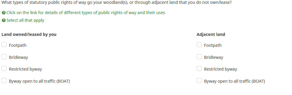 <script type="text/javascript" charset="utf-8"> $(document).ready(function() { var SubHeading1="<strong>Land owned/leased by you</strong>"; var SubHeading2="<strong>Adjacent land</strong>"; var thisQuestion = $('#question{QID}'); // Insert sub-headings $('.checkbox-item:eq(0)', thisQuestion).before('<li class="inserted-sub-heading"><span>'+SubHeading1+'</span></li>'); $('.checkbox-item:eq(4)', thisQuestion).before('<li class="inserted-sub-heading"><span>'+SubHeading2+'</span></li>'); }); </script>