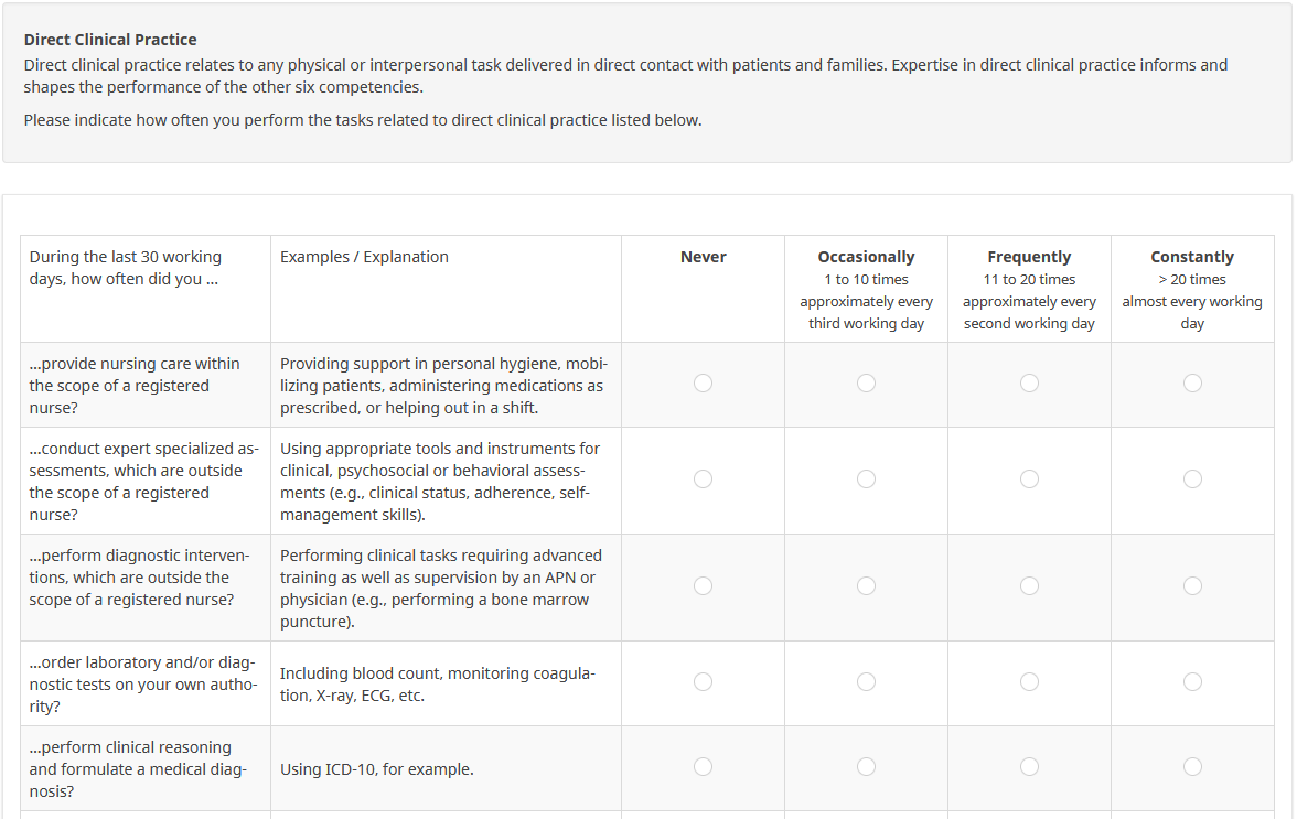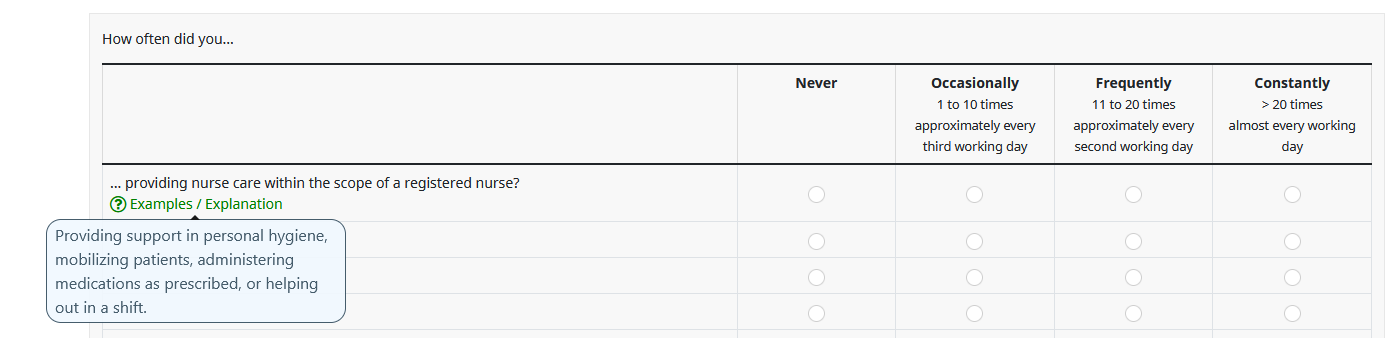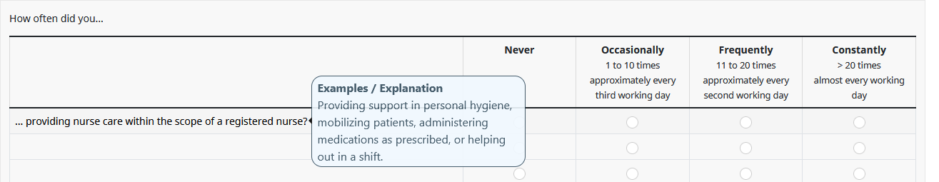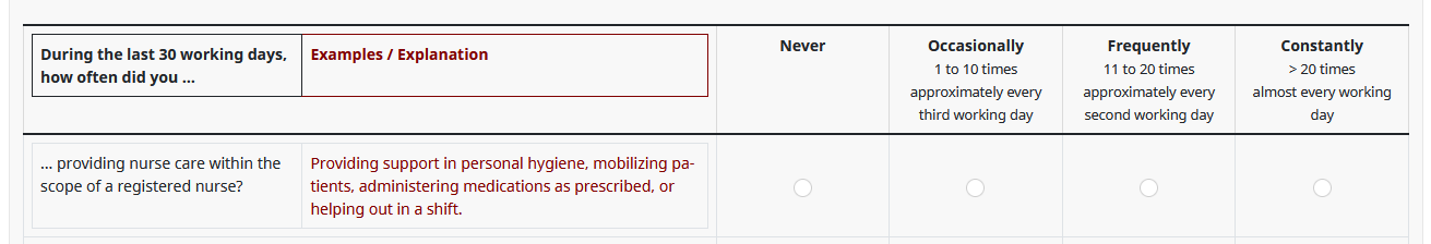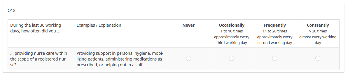 <script type="text/javascript" charset="utf-8"> $(document).on('ready pjax:scriptcomplete',function(){ var thisQuestion = $('#question{QID}'); // Add a question class thisQuestion.addClass('custom-array'); // Column-specific classes $('table.subquestion-list tr', thisQuestion).each(function(i) { $('th, td', this).each(function(i) { $(this).addClass('column-'+i); }); }); }); </script><style type="text/css"> .custom-array table.subquestion-list col { width: auto !important; } .custom-array table.subquestion-list thead .column-0 { width: 22%; } .custom-array table.subquestion-list thead .column-1 { width: 30%; } .custom-array table.subquestion-list thead .column-2 { width: 12%; } .custom-array table.subquestion-list thead .column-3 { width: 12%; } .custom-array table.subquestion-list thead .column-4 { width: 12%; } .custom-array table.subquestion-list thead .column-5 { width: 12%; } </style>