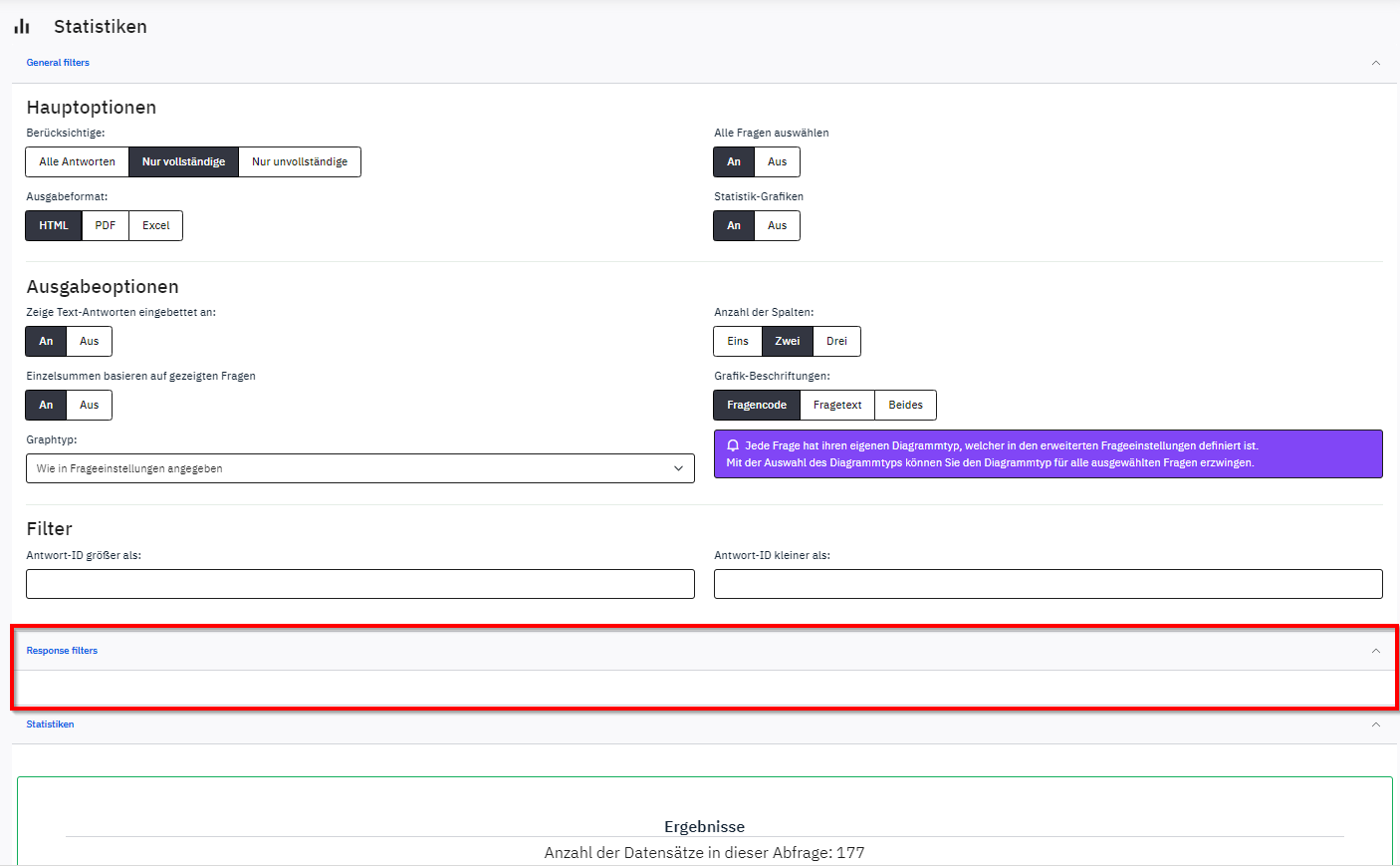 I am in the process of evaluating my finished survey. I already created statistics using the provided tool from limesurvey. To specify my results I want to use the repsonse filters. Unfortunately I am not able to select options to specify the the results. If I click on the section response filters, it shows an empty dropdown menue (see screenshot attached).