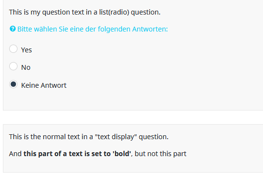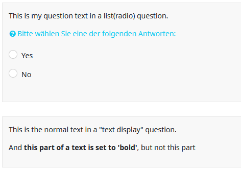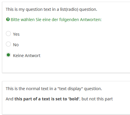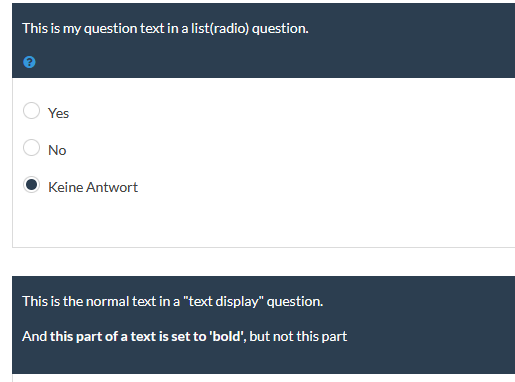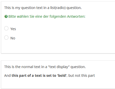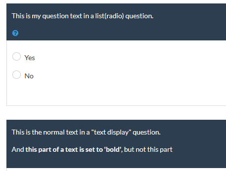 Here my results in 6.5.18For the "text display" type question, all text is automatically shown in bold. I'd consider that a bug since bold wasn't selected in the editor. This happens with every "text display" question