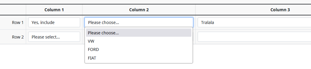 This is the script that I already worked on. Here the drop-down for the first column is already working. And the third column has a text field, however it's still obligatory to be filled out.