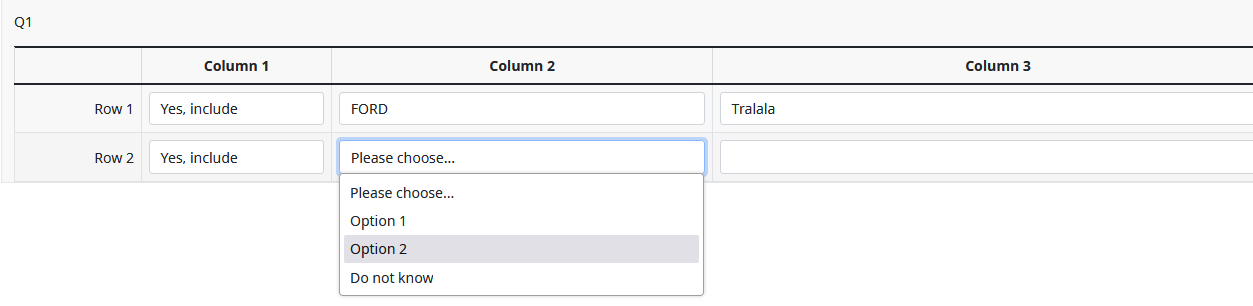 The second column (Code: QX002) should then be dependent on the first column. If the respondent chose in the first column 'yes, include', then they would need to choose a logic in the second column with a drop-down. The tricky part here is that each row would contain different drop-down choices for each criteria.
