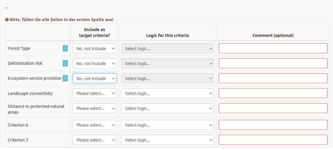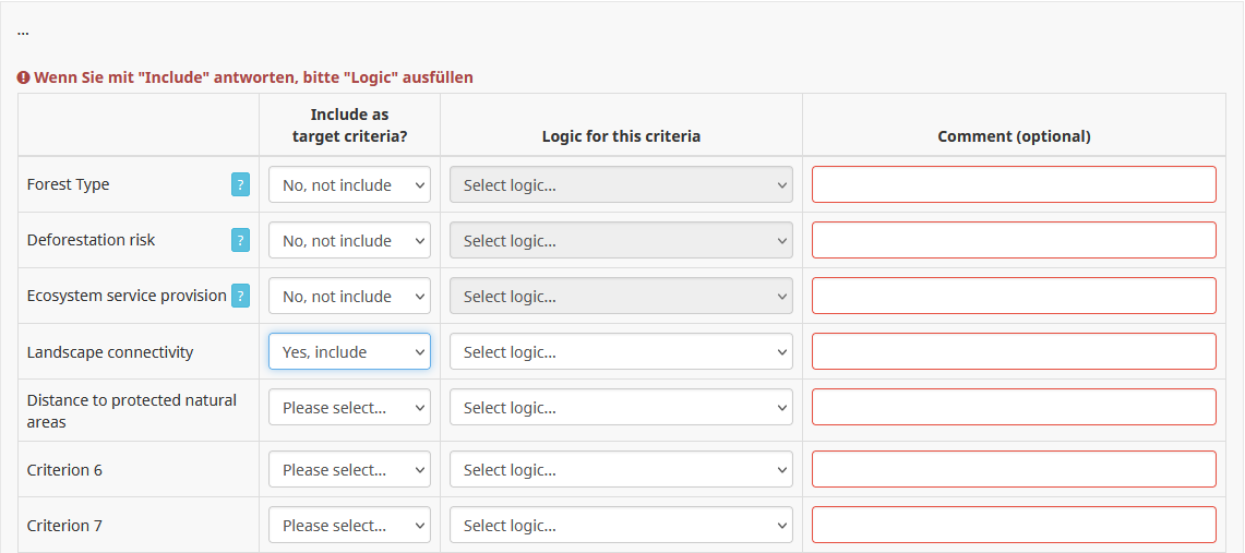 For example, if the respondent decides to include criterion 1 (e.g. presence of NGOs), they must select the logic from a drop-down list in this second column. For this criterion, the choice would be between: Areas with a high presence of NGOs, Areas with a moderate presence of NGOs, Areas with a low or no presence of NGOs. For criterion 2, there would be other logics from which respondents would have to choose and so on. Please see pictures attached.