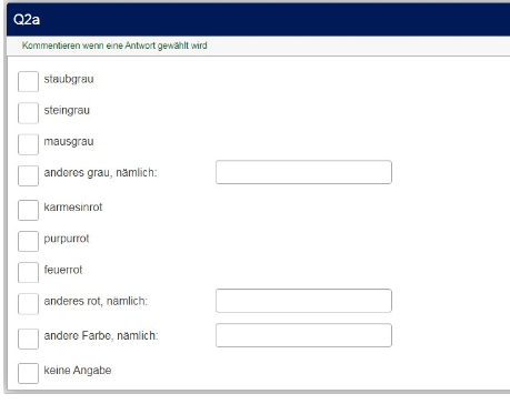 The second option sounds good to me. But could you also tell me, how to hide the fields which I don't need? (I looked through all possible options but couldn't find it.)2. A question of type "multiple with comments" where you hide the not needed comment fields