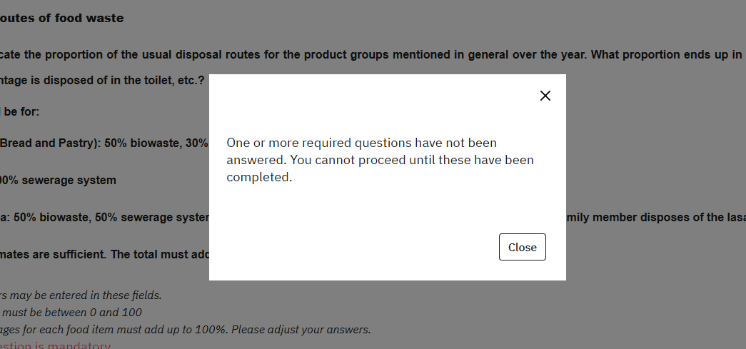 and when I test the survey and enter 100 for each row I get this window: