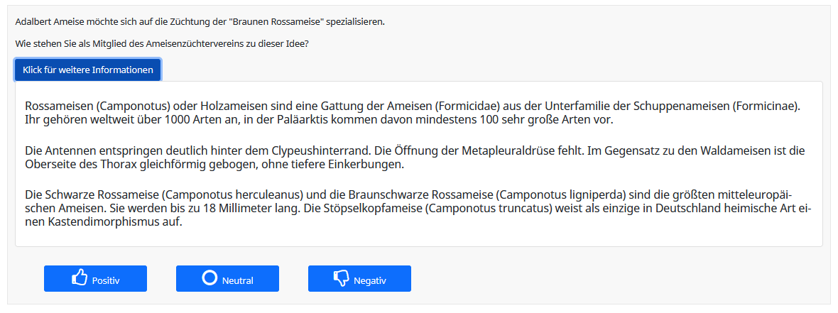 <p>Adalbert Ameise möchte sich auf die Züchtung der "Braunen Rossameise" spezialisieren.</p> <p>Wie stehen Sie als Mitglied des Ameisenzüchtervereins zu dieser Idee?</p> <button aria-controls="collapseExample" aria-expanded="false" class="btn btn-xs btn-primary" data-bs-target="#collapseExample" data-bs-toggle="collapse" type="button">Klick für weitere Informationen</button> <div class="collapse" id="collapseExample"> <div class="card card-body"> <h5>Rossameisen (Camponotus) oder Holzameisen sind eine Gattung der Ameisen (Formicidae) aus der Unterfamilie der Schuppenameisen (Formicinae). Ihr gehören weltweit über 1000 Arten an, in der Paläarktis kommen davon mindestens 100 sehr große Arten vor.</h5> ... </div> </div>
