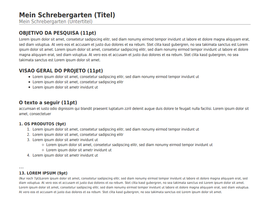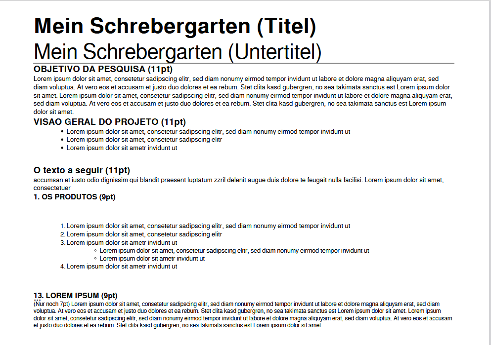 <p style="margin-bottom: 0cm;font-weight:bold;font-size:11pt">OBJETIVO DA PESQUISA (11pt)</p> <p style="font-size:8pt">Lorem ipsum dolor sit amet, consetetur sadipscing elitr, sed diam nonumy eirmod tempor invidunt ut labore et dolore magna aliquyam erat, sed diam voluptua. At vero eos et accusam et justo duo dolores et ea rebum. Stet clita kasd gubergren, no sea takimata sanctus est Lorem ipsum dolor sit amet. Lorem ipsum dolor sit amet, consetetur sadipscing elitr, sed diam nonumy eirmod tempor invidunt ut labore et dolore magna aliquyam erat, sed diam voluptua. At vero eos et accusam et justo duo dolores et ea rebum. Stet clita kasd gubergren, no sea takimata sanctus est Lorem ipsum dolor sit amet.</p> <p style="margin-bottom: 0cm;font-weight:bold;font-size:11pt">VISAO GERAL DO PROJETO (11pt)</p> <ul style="font-size:8pt"> <li><p style="margin-bottom: 0cm">Lorem ipsum dolor sit amet, consetetur sadipscing elitr, sed diam nonumy eirmod tempor invidunt ut</p></li> <li><p style="margin-bottom: 0cm">Lorem ipsum dolor sit amet, consetetur sadipscing elitr</p></li> <li><p>Lorem ipsum dolor sit ametr invidunt ut</p></li> </ul> <p style="margin-bottom: 0cm;font-weight:bold;font-size:11pt">O texto a seguir (11pt)</p> <p style="font-size:8pt">accumsan et iusto odio dignissim qui blandit praesent luptatum zzril delenit augue duis dolore te feugait nulla facilisi. Lorem ipsum dolor sit amet, consectetuer</p> <p style="margin-bottom: 0cm;font-weight:bold;font-size:9pt">1. OS PRODUTOS (9pt)</p> <ol style="font-size:8pt"> <li><p style="margin-bottom: 0cm">Lorem ipsum dolor sit amet, consetetur sadipscing elitr, sed diam nonumy eirmod tempor invidunt ut</p></li> <li><p style="margin-bottom: 0cm">Lorem ipsum dolor sit amet, consetetur sadipscing elitr</p></li> <li><p style="margin-bottom: 0cm">Lorem ipsum dolor sit ametr invidunt ut</p> <ul> <li><p style="margin-bottom: 0cm">Lorem ipsum dolor sit amet, consetetur sadipscing elitr, sed diam nonumy eirmod tempor invidunt ut</p></li> <li><p style="margin-bottom: 0cm">Lorem ipsum dolor sit ametr invidunt ut</p></li> </ul> </li> <li><p style="margin-bottom: 0cm">Lorem ipsum dolor sit ametr invidunt ut</p></li> </ol> ... <p style="margin-bottom: 0cm;font-weight:bold;font-size:9pt">13. LOREM IPSUM (9pt)</p> <p style="font-size:7pt">;(Nur noch 7pt) Lorem ipsum dolor sit amet, consetetur sadipscing elitr, sed diam nonumy eirmod tempor invidunt ut labore et dolore magna aliquyam erat, sed diam voluptua. At vero eos et accusam et justo duo dolores et ea rebum. Stet clita kasd gubergren, no sea takimata sanctus est Lorem ipsum dolor sit amet. Lorem ipsum dolor sit amet, consetetur sadipscing elitr, sed diam nonumy eirmod tempor invidunt ut labore et dolore magna aliquyam erat, sed diam voluptua. At vero eos et accusam et justo duo dolores et ea rebum. Stet clita kasd gubergren, no sea takimata sanctus est Lorem ipsum dolor sit amet.</p>