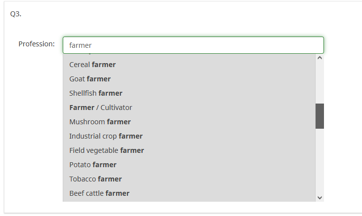 <script src="https://cdnjs.cloudflare.com/ajax/libs/easy-autocomplete/1.3.5/jquery.easy-autocomplete.min.js"></script> <link href="https://cdnjs.cloudflare.com/ajax/libs/easy-autocomplete/1.3.5/easy-autocomplete.css" rel="stylesheet" /> <script type="text/javascript"> $(document).on('ready pjax:scriptcomplete',function(){ // Define the data var options = { data: [ "Lampshade maker", "Tree feller / Logger", "Slaughterer", "Quarry worker", ... "Escort", "Dealer", "Drug dealer" ], list: { maxNumberOfElements: 100, match: { enabled: true } } }; $("#question{QID} input[type=text]").easyAutocomplete(options); }); </script>