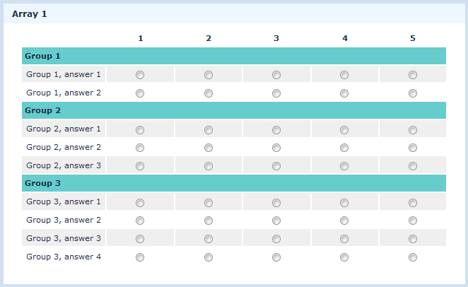 <script type="text/javascript" charset="utf-8"> $(document).ready(function() { // Call the function to insert sub-titles // Parameters (Question ID, Row number, Sub-title) insertSubTitle(QQ, 1, 'Group 1'); insertSubTitle(QQ, 3, 'Group 2'); insertSubTitle(QQ, 6, 'Group 3'); // A function to insert sub-title rows in an array function insertSubTitle(qID, row, subtitle) { // Add some row-specific classes $('#question'+qID+' table.question tbody[id^="javatbd"]').each(function(i, el){ $(el).addClass('ansRow-'+(i+1)); }); // Find number of columns var cols = $('#question'+qID+' table.question tbody[id^="javatbd"]:first tr:first > *').length; // Define the row to be inserted var insertedRow = '<tbody> \ <tr class="insertedRow"> \ <td colspan="'+cols+'">'+subtitle+'</td> \ </tr> \ </tbody>'; // And insert the row $(insertedRow).insertBefore('#question'+qID+' .ansRow-'+row+''); // Fix up the row background colours var rowIndex = 0; $('#question'+qID+' table.question tr').each(function(i, el){ rowIndex ++; if($(el).hasClass('insertedRow')) { rowIndex = 0; } $(el).removeClass('array1, array2'); if(rowIndex % 2 == 0) { $(el).addClass('array1'); } else { $(el).addClass('array2'); } }); } }); </script>