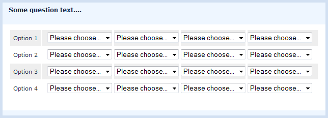 /* Line the questions up side-by-side */ #question500, #question505, #question510, #question515 { float: left; } #question500 { margin-left: 12.5%; } /* Push the question tables to full width */ #question500 .question-wrapper, #question505 .question-wrapper, #question510 .question-wrapper, #question515 .question-wrapper { margin: 0 auto 10px 0; width: 100%; } /* Lose some padding... */ #question500 .question-wrapper td, #question505 .question-wrapper td , #question510 .question-wrapper td, #question515 .question-wrapper td{ padding: 0.5em 0; } /* but we still want some padding on the left and right of the group */ #question500 .question-wrapper td { padding-left: 1em ; } #question515 .question-wrapper td { padding-right: 1em ; } /* Set the width of the subquestion cells in the first array... */ #question500 table.question tbody th { width: auto; } /* and hide the subquestion cells in subsequent arrays */ #question505 table.question tbody th, #question510 table.question tbody th, #question515 table.question tbody th { display: none; } /* Hide the question text in all but the first array */ #question505 td.questiontext, #question510 td.questiontext, #question515 td.questiontext { color: #EEF6FF; }