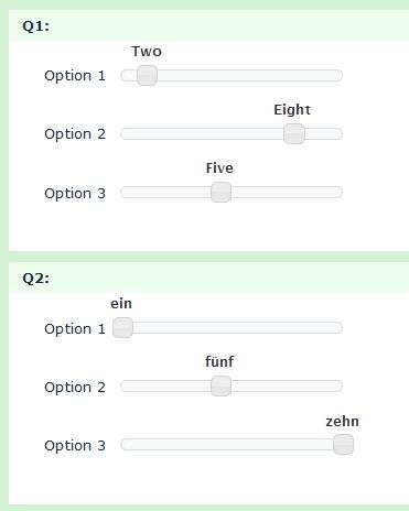 // Call the sliderCallOutText plugin for all slider questions with some custom text $('.multinum-slider').sliderCallOutText( { text_1 : 'ein', text_2 : 'zwei', text_3 : 'drei', text_4 : 'vier', text_5 : 'fünf', text_6 : 'sechs', text_7 : 'sieben', text_8 : 'acht', text_9 : 'neun', text_10 : 'zehn' });