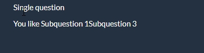 {join(if(Q1_SQ001==1,Q1_SQ001.question,""),if(Q1_SQ002==1,Q1_SQ002.question,""),if(Q1_SQ003==1,Q1_SQ003.question,""))}