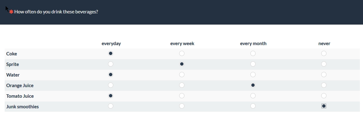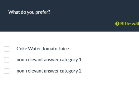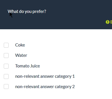 Beverages ( {if(Q1_SQ001 == "A1", Q1_SQ001.question, )} {if(Q1_SQ001 == "A1", Q1_SQ002.question, )} {if(Q1_SQ001 == "A1", Q1_SQ003.question, )} )