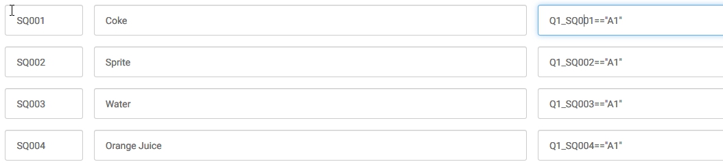 {if(Q1_SQ001 == "A1", Q1_SQ001.shown, )} {if(Q1_SQ001 == "A1", Q1_SQ002.shown, )} {if(Q1_SQ001 == "A1", Q1_SQ003.shown, )}