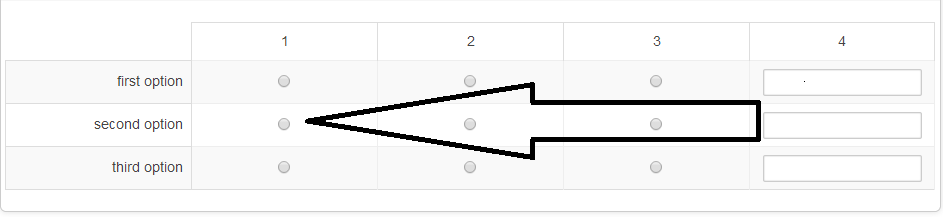 <script> $(document).ready(function(){ $('#question{QID} tbody tr td:last-child').each(function(){ var textinputid=$(this).find('input:radio').attr('id'); $(this).find('input:radio').hide(); $(this).append("<input type='text' data-copy='"+textinputid+"' />"); }); }); </script>