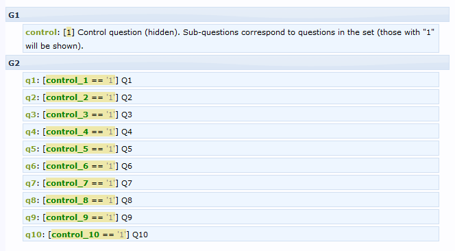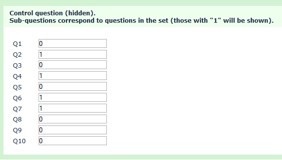 <script type="text/javascript" charset="utf-8"> $(document).ready(function() { // Hide this question $('#question{QID}').hide(); // An array defining total number of questions in the set and number to be shown // In this case, 4 of 10 will be shown var setArray = [1, 1, 1, 1, 0, 0, 0, 0, 0, 0]; // Shuffle the array setArray = $.shuffle(setArray); // Loop Through the array and populate the sub-questions $(setArray).each(function(i, value) { if($('#question{QID} input.text:eq('+i+')').val() == '') { $('#question{QID} input.text:eq('+i+')').val(value); } }); }); // A function to shuffle arrays (function($){ $.fn.shuffle = function() { return this.each(function(){ var items = $(this).children(); return (items.length) ? $(this).html($.shuffle(items)) : this; }); } $.shuffle = function(arr) { for( var j, x, i = arr.length; i; j = parseInt(Math.random() * i), x = arr[--i], arr[i] = arr[j], arr[j] = x ); return arr; } })(jQuery); </script>