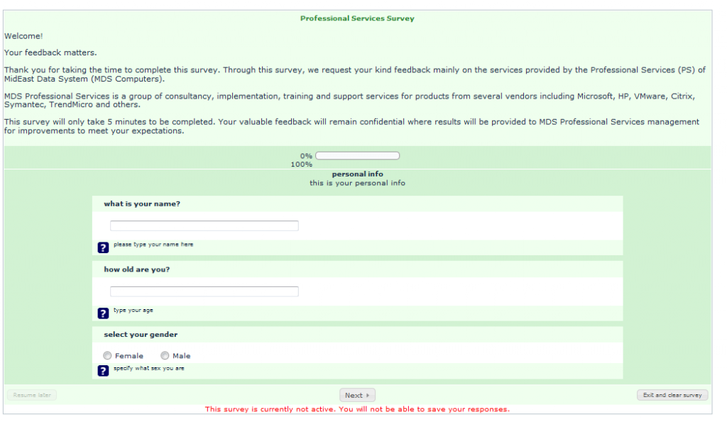 when i press test survey first survey title, welcome message and description show in the page and then i click next to start the survey. i am dividing it into question groups