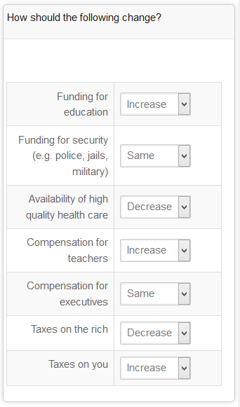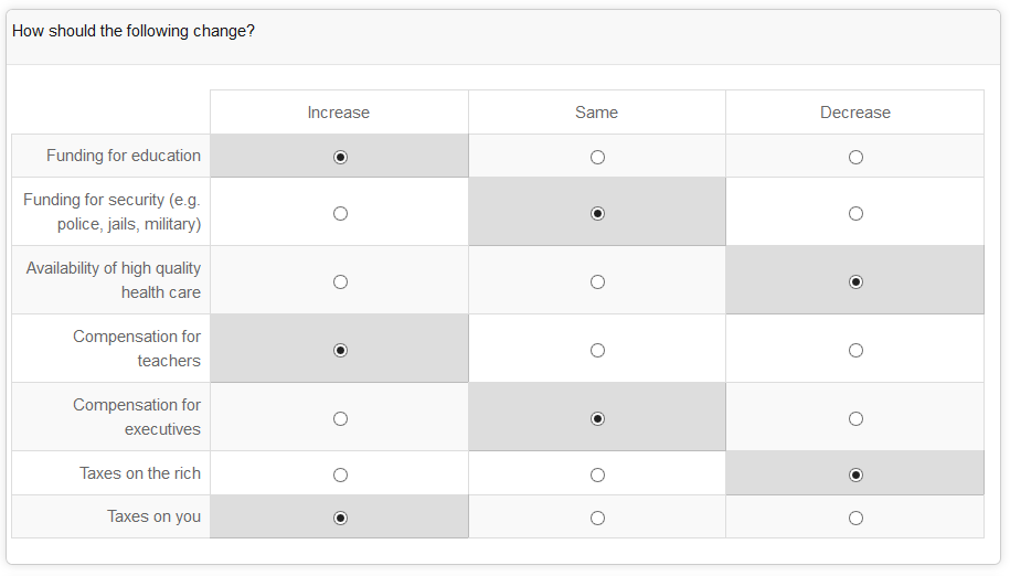 $(document).ready(function(){ $('.array-10-pt, .array-flexible-row, .array-5-pt, .array-increase-same-decrease, .array-yes-uncertain-no').responsiveArray(); }); /***** A plugin to insert drop-downs into arrays for small screens Copyright (C) 2014 - Tony Partner (https://partnersurveys.com) Licensed MIT, GPL Version - 1.0 Create date - 09/06/14 *****/ (function( $ ){ $.fn.responsiveArray = function(options) { return this.each(function() { var thisQuestion = $(this); var thisQID = $(thisQuestion).attr('id').split('question')[1]; // Some classes $(thisQuestion).addClass('responsive-array'); $('table.questions-list tr', thisQuestion).each(function(i){ $('> *', this).each(function(i){ $(this).addClass('col-'+i); if(i != 0) { $(this).addClass('expanded'); } }); }); // Insert a column $('.col-0', thisQuestion).after('<td class="dropdown-cell" />'); // Insert dropdowns $('body').append('<select style="display:none;" class="responsive-select responsive-select-'+thisQID+'" />'); $('table.questions-list thead th.expanded', thisQuestion).each(function(i){ $('.responsive-select-'+thisQID).append('<option value="">'+$(this).text()+'</option>'); }); $('table.questions-list tbody .dropdown-cell', thisQuestion).append($('.responsive-select-'+thisQID+'').clone()); $('tr.radio-list', thisQuestion).each(function(i){ var thisRow = $(this); $('input.radio', this).each(function(i){ $('.responsive-select-'+thisQID+' option:eq('+i+')', thisRow).attr('value', $(this).attr('id')); }); $('.responsive-select-'+thisQID+'', thisRow).val($('input.radio:checked', thisRow).attr('id')); }); $('.responsive-select-'+thisQID+'', thisQuestion).show(); // Listeners on radios $('input.radio', thisQuestion).click(function(event) { var thisRow = $(this).closest('tr'); var thisID = $(this).attr('id'); //$('option[value="'+thisID+'"]').attr('selected', 'selected'); $('.responsive-select', thisRow).val(thisID); }); // Listeners on dropdowns $('.responsive-select-'+thisQID+'').change(function() { $('#'+$(this).val()+'').click(); }); }); }; })( jQuery );