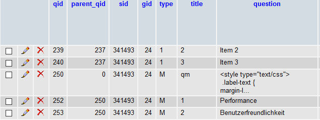 questions and subquestions by questionID (parentID is the questionID, if there are subquestions (arrays, etc)