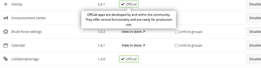 Nextcloud app store shows which plugins are official developed in the community and are constantly used and checked with all releases.