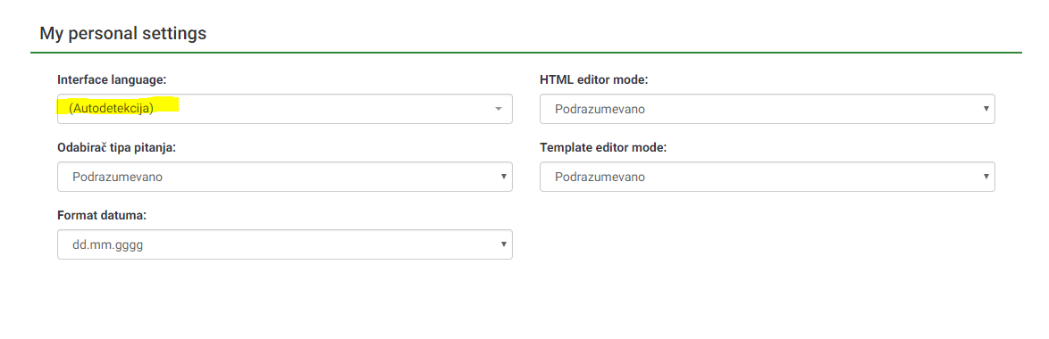 the application language is not the survey language. To change the application language, go to your profile, then "my personal settings" then "interface language"