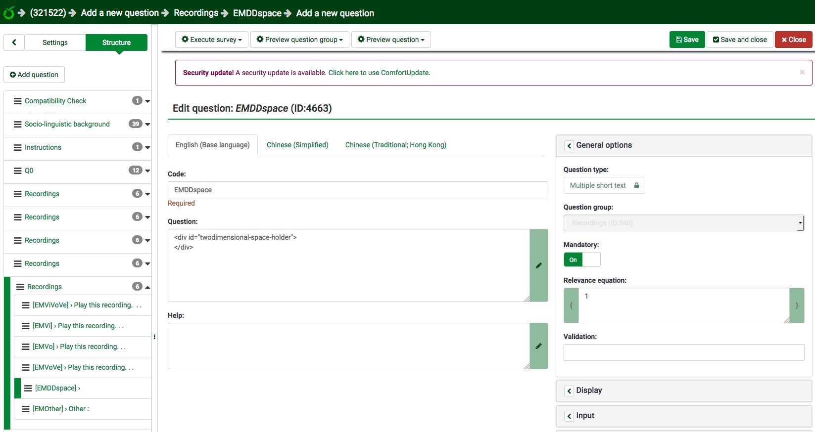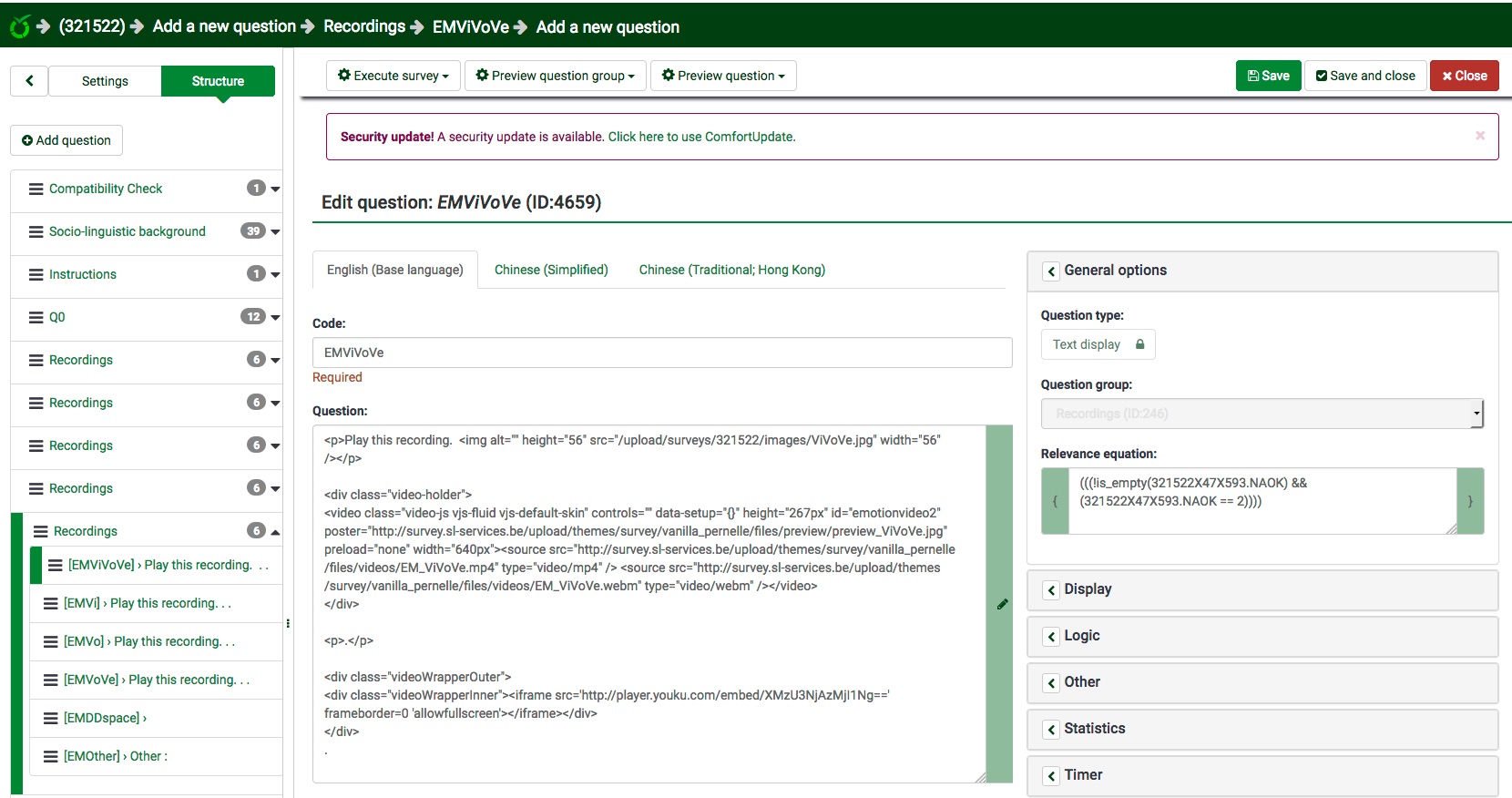 I imported 12 times the same QG and only changed the address of the recordings in the div's (in the four first questions) and the relevance equations of the question. So these 12 question groups should all work in the same way.