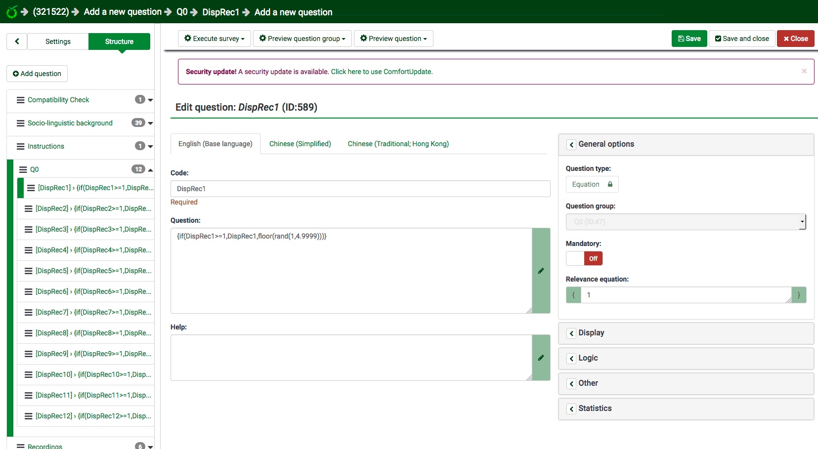 Of these 4 questions, each participant only gets to see one of them, which is implemented via 12 random numbers generated at the beginning of the survey in a hidden question group,