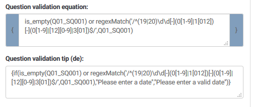 {if((checkdate(intval(substr(Q01_SQ001,5,2)),intval(substr(Q01_SQ001,8,2)),intval(substr(Q01_SQ001,0,4))) OR is_empty(Q01_SQ001)) ,"Please enter a date","Please enter a valid date")}