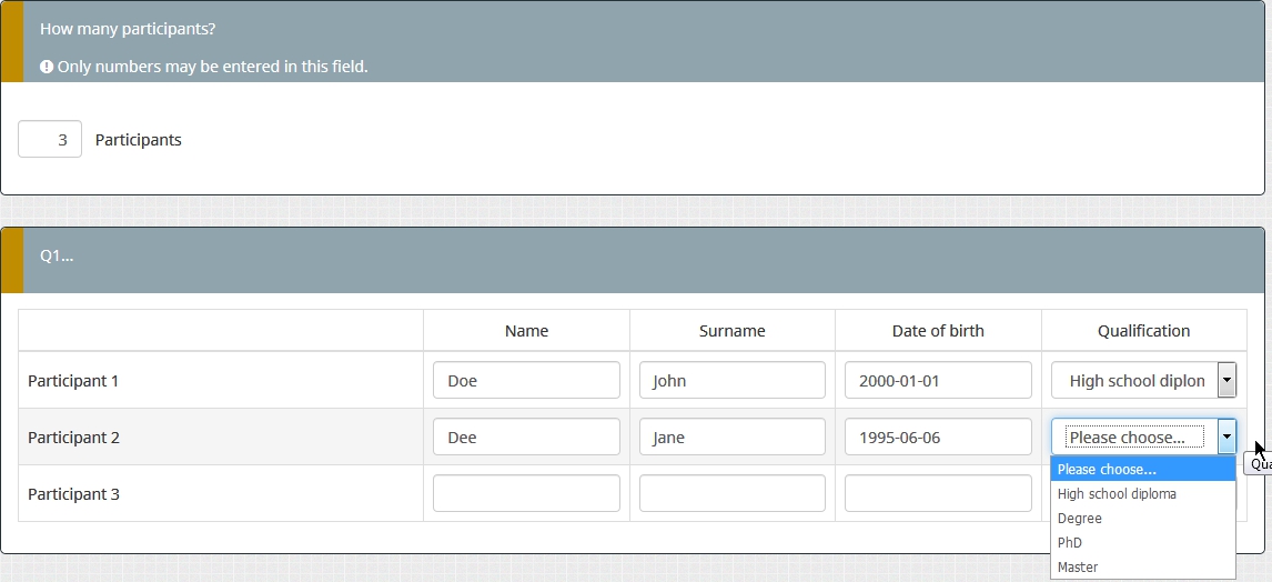 <script type="text/javascript" charset="utf-8"> $(document).on('ready pjax:scriptcomplete',function(){ var thisQuestion = $('#question{QID}'); // Insert selects $('.answer-item.answer_cell_X004', thisQuestion).addClass('with-select').append('<select class="inserted-select form-control list-question-select">\ <option value="">Please choose...</option>\ <option value="1">High school diploma</option>\ <option value="2">Degree</option>\ <option value="3">PhD</option>\ <option value="4">Master</option>\ </select>'); // Listeners $('.inserted-select', thisQuestion).on('change', function(i) { if($(this).val() != '') { $(this).closest('.answer-item').find('input:text').val($.trim($('option:selected', this).text())).trigger('change'); } else { $(this).closest('.answer-item').find('input:text').val('').trigger('change'); } }); // Returning to page $('.with-select input:text', thisQuestion).each(function(i) { var thisCell = $(this).closest('.answer-item'); var inputText = $.trim($(this).val()); var selectval = $('select.inserted-select option', thisCell).filter(function () { return $(this).html() == inputText; }).val(); $('select.inserted-select', thisCell).val(selectval); }); // Clean-up styles $('select.inserted-select', thisQuestion).css({ 'max-width': '100%' }); $('.with-select input:text', thisQuestion).css({ 'position': 'absolute', 'left': '-9999em' }); }); </script>