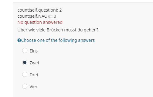 {% set questionCount = processString("{count(self.question)}") %} count(self.question): {{ questionCount }} <br> count(self.NAOK): {{ processString("{count(self.NAOK)}") }} <br> {{ processString("{if(count(self.NAOK) == 0,'<span class=\"text-danger\">No question answered</span>')}") }} {{ processString("{if(count(self.NAOK) gt 0 and count(self.NAOK) lt "~questionCount~",'<span class=\"text-warning\">'+count(self.NAOK)+' question(s) answered</span>')}") }}