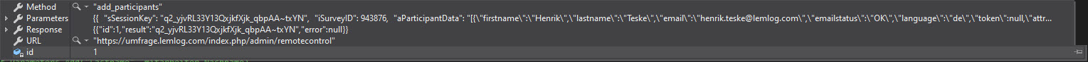 i must add new participants to lime survey i became no error from api attached the api call and the response.