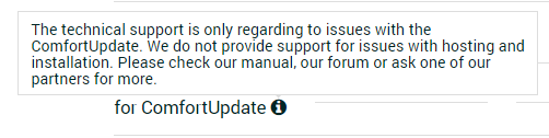 - Technical support for the comfort update feature (rest is on you or the person that installs LS for you, though I am sure that you can hire them or any official partner on an hourly basis. But for third party extensions / themes it will probably take quite a lot of time for someone unfamiliar with the code to get into it and fix anything, so you'd probably rather go to the person that developed it in the first place. They should know their code best.