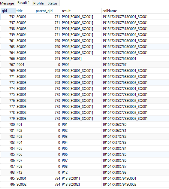 DECLARE @surveyid varchar(50) SET @surveyid = 'ENTER YOUR SID HERE' DECLARE @importquestions as varchar(3000) SET @importquestions = 'SELECT * INTO MSLimeSurvey25.dbo.lime_questions FROM openquery(LIMESURVEY25, ''SELECT * FROM limesurvey25.lime_questions WHERE language=''''en'''' AND sid='+@surveyid+''')' EXEC(@importquestions) IF COL_LENGTH('dbo.[lime_questions]','LimeColumnName') IS NULL BEGIN ALTER TABLE dbo.[lime_questions] ADD LimeColumnName nvarchar(128) END UPDATE [dbo].[lime_questions] SET [LimeColumnName] = cast([sid] as varchar(50))+'X'+cast([gid] as varchar(50))+(case when [parent_qid] = 0 then 'X'+ cast([qid] as varchar(50)) ELSE 'X'+ cast([parent_qid] as varchar(50))+[title] END) IF COL_LENGTH('dbo.[lime_questions]','question') IS NOT NULL BEGIN ALTER TABLE dbo.[lime_questions] Alter Column question varchar(MAX) END