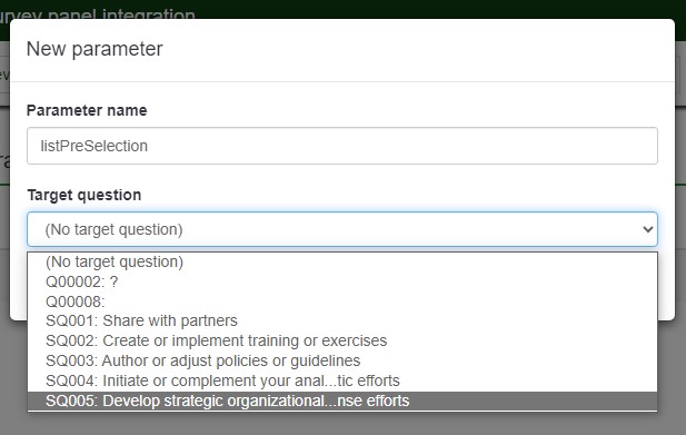 The manual is showing screenshots of newer versions of LimeSurvey.When trying to add this parameter, the dialog box is labeled "Add Parameter" and not "Add URL Parameter" as illustrated in Panel integration - LimeSurvey Manual . I know I'm missing something. But, what?