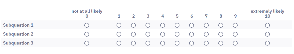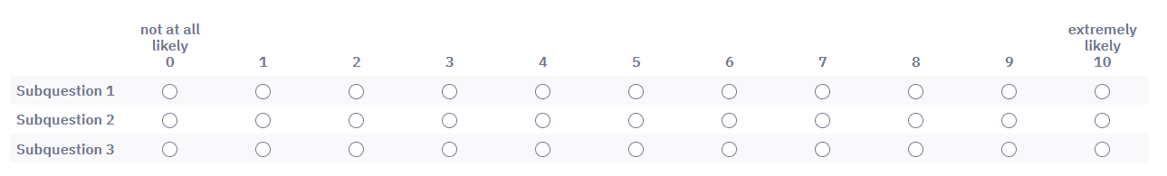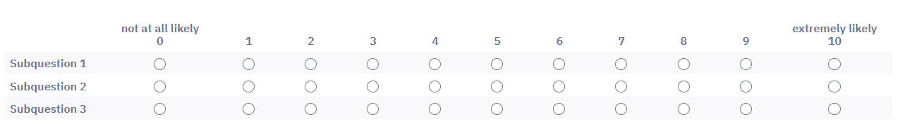 <script type="text/javascript" charset="utf-8"> $(document).on('ready pjax:scriptcomplete',function(){ // Insert the column categories $('#question{QID} table.subquestion-list thead tr:eq(0) td:eq(0)').remove(); $('#question{QID} table.subquestion-list thead').prepend('<tr class="ls-heading">\ <td rowspan="2" colspan="1" style="border-top:0 !important;"></td>\ <th class="answer-text inserted-header" colspan="5" style="text-align:left;font-size:14pt;color:maroon;background-color:silver">unlikely to recommend</th>\ <th class="answer-text inserted-header" colspan="6" style="text-align:right;font-size:14pt;color:maroon;background-color:silver">likely to recommend</th>\ </tr>'); }); </script>
